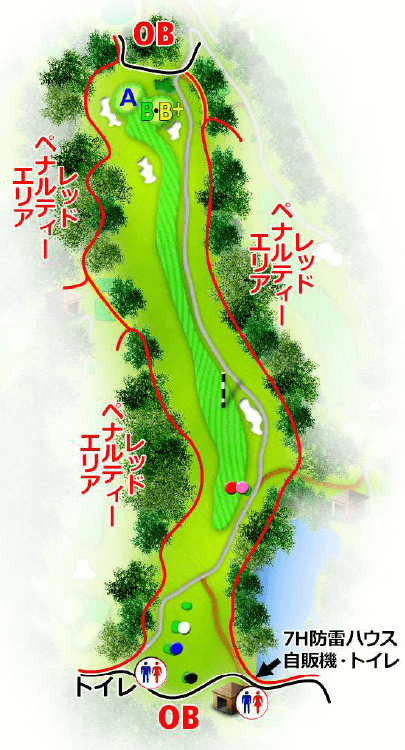 ティーショットは正面バンカーの左端狙い。 左林すれすれはリスク大。 セカンドショットはカート道に沿って。 グリーン周りのバンカーに注意。
